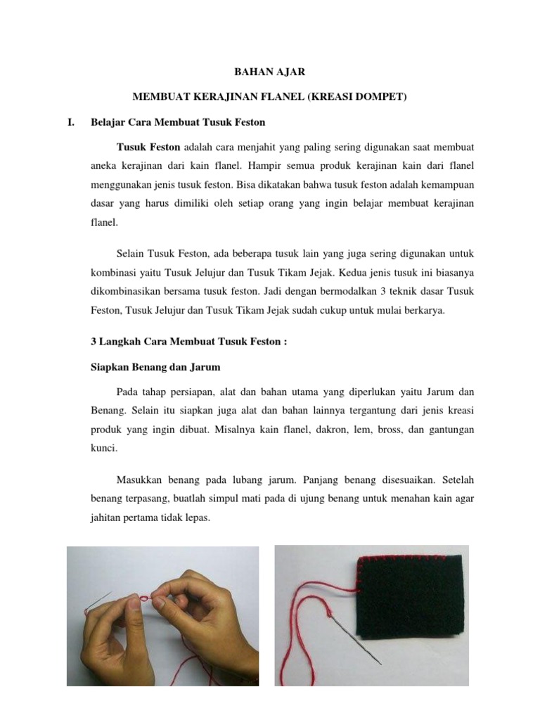 Modul pembelajaran prakarya teknik dasar tusuk jahit. Terakhir, proses pemasangan asesoris atau nishing sehingga menghasilkan kerajinan tekstil. Teknik dasar menjahit tusuk flanel umumnya digunakan sebagai metode menjahit pinggiran dari busana yang diobras. Namun, teknik menyulam feston tidak hanya digunakan untuk memberikan tampilan yang bagus pada tepi selimut saja, tetapi juga dapat mengamankan jahitannya. Tusuk feston juga bisa berfungsi sebagai tusuk hias. Berikut ini akan kami bahas 8 macam teknik tusuk jahit yang akan kami sertai dengan contoh gambar. Pertama, pembuatan serat/benang menjadi kain/tekstil yang menggunakan teknik tenun. Oleh karena itu, kemampuan dasar menjahit dengan tusuk feston ini harus dimiliki oleh setiap orang yang ingin mempelajari. Tusuk feston tusuk feston berfungsi untuk penyelesaian tiras seperti tiras lingkar kerung lengan atau pada pinggiran pakaian bayi. Alat atau bahan yang digunakan saat menghias kain menggunakan tusuk hias feston dimana yang mempunyai tujuan untuk fungsi hias. Teknik tusuk batang khusus untuk membuat hiasan pada kain atau baju. Berikut ini gambar dan keterangan cara menjahit dengan teknik tusuk feston. Alat kecil ini kerap digunakan untuk menjahit berbagai macam kain mulai dari renda meja, selimut, taplak meja, dan lain sebagainya.