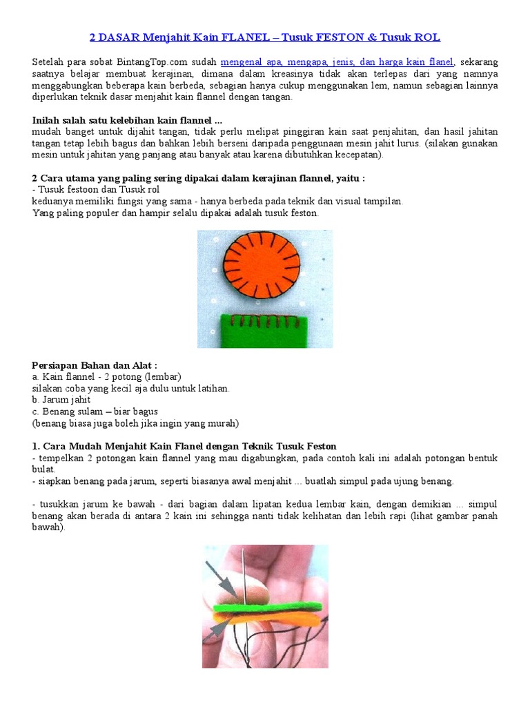 Tusuk feston dalam praktek penerapanya itu mirip seperti yang digunakan untuk tusuk lubang kancing sob,perbedaanya cuma pada jarak lebih jauh antar. Berikut ini akan kami bahas 8 macam teknik tusuk jahit yang akan kami sertai dengan contoh gambar. Dalam pembuatan kerajinan dari kain flanel, tusuk feston biasanya juga dikombinasikan dengan tusuk jelujur dan tusuk tikam jejak. Untuk membuat tusuk feston, kamu perlu memasukan benang dari bawah, beri jarak, lalu masukan dari atas dengan sisakan sedikit. Tusuk silang biasa digunakan pada kain dengan tenunan. Biasanya teknik ini digunakan untuk menyelaraskan tiras dengan jahitan. Bahkan tidak perlu memakai mesin jahit untuk membuat berbagai aksesoris flanel. Tusuk feston tusuk feston berfungsi untuk penyelesaian tiras seperti tiras lingkar kerung lengan atau pada pinggiran pakaian bayi. Tusuk pipih yang rapat ini digunakan untuk mengisi garis yang sebelumnya ditandai dengan tusuk tikam jejak. Cara menjahit tusuk sembunyi ini cukup mudah kok, kamu hanya perlu menjahit dari kiri dan kanan dengan posisi yang agak miring. Mba saya udah coba bikin sepatu dari kain flanel tetapi hasilnya kurang memuaskan. Bullion adalah teknik lanjutan yang jarang digunakan oleh penjahit. Alat atau bahan yang digunakan saat menghias kain menggunakan tusuk hias feston dimana yang mempunyai tujuan untuk fungsi hias.